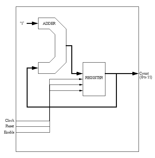 From the diagram presented above describe an architecure for a counter using a process and sequential language elements. Hint: an IEEE package called std_logic_arith defines a type unsigned for which a + operator is defined. A signal or variable of type unsigned can be used to effect an add operation and there is a conversion function for assigning it to a std_logic_vector port.