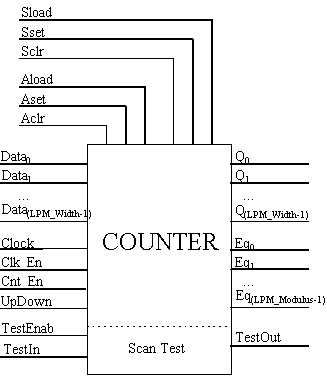 Note 3: Since the counter goes through C counts where 0 < = C < Modulus, up to Modulus EqC ports can be used. Modulus is either the value specified by LPM_Modulus if present, or 2LPM_Width. The EqC ports are optional; not all of the EqC ports need to appear on the symbol. Generally there will only be one Eq port which will be EqLPM_Modulus-1 which is the terminal count.. The EqC outputs are asynchronous. For any count, EqC goes high when the count is C.