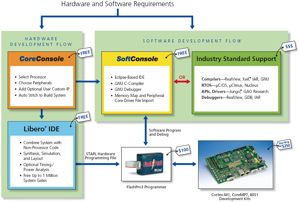 debug using FlashPro3. Alternatively, use the output of CoreConsole with any number of industry-standard compilers and debuggers.Choose from ARM7, Cortex-M1, 8051s, and CoreABC