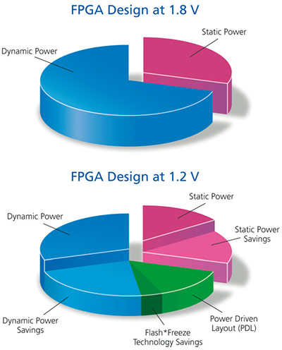 In this case, all the devices can operate from 1.2 V, so compare basic power consumption at, say, 10,000 logic elements.