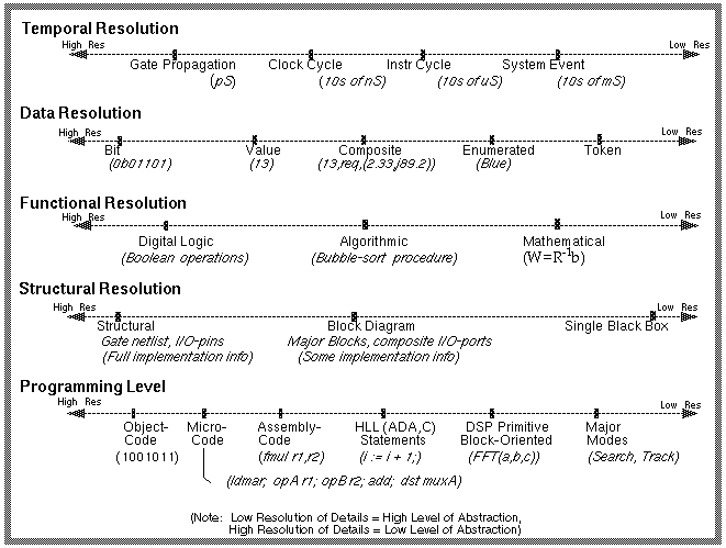 The Data Resolution axis represents the resolution with which the format of values are specified in a model. The contents of a register could be described at these levels of resolution, from high to low: Note that resolution is analogous to precision as distinguished from accuracy. Each representation is equally accurate; however, the first case resolves the value closer to the form actually contained in the target device. The more abstract the representation of a value is, the less implementation details are resolved.