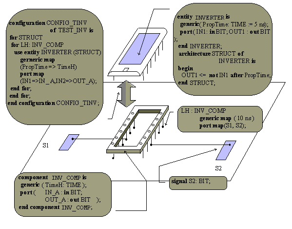 There is one block configuration in the CONFIG_TINV configuration declaration, it indicates that STRUCT_T architecture body will be used. INV_COMP component configuration appears in the block configuration. The CONFIG_TINV configuration for the TEST_INV design entity allows associating LG component: INV_COMP with INVERTER design entity and its STRUCT_1 architecture body.