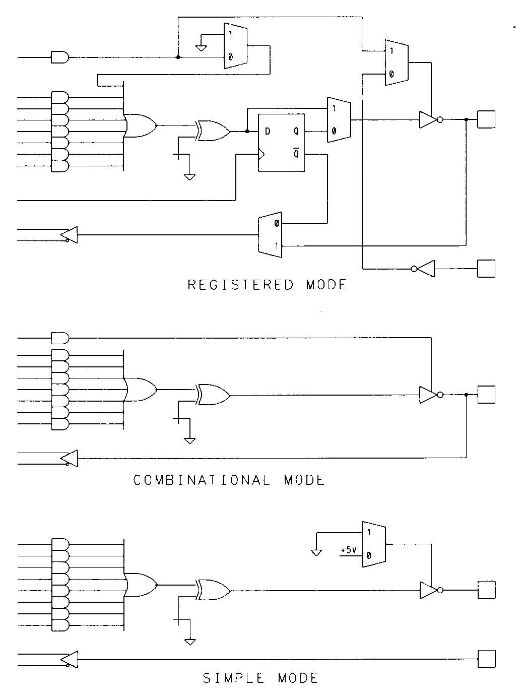 The most important difference is that the OR gate is considered to be a part of the output macrocell. This is necessary because of the differing architectures of combinational and registered outputs in devices like the 16R4 described earlier. The control fuses for the GAL macrocells allow each macrocell to be configured in one of three basic configurations. These configurations correspond the various types of I/O configurations found in the PAL devices that the GAL is designed to replace.