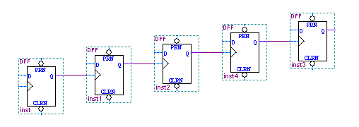 A design should not contain ripple clock structures, that is, structures where the outputs of two or more registers in a cascade each directly drives the input clock port of the following register in the cascade. Cascading registers should have only one output, or no output, that directly drives the following register's input clock port. The following image shows an example of a ripple clock structure: