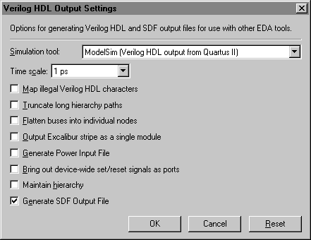 | You open this dialog box by selecting a Verilog HDL simulation or timing analysis tool in the EDA tools list in the EDA Tool Settings page of the Settings dialog box (Assignments menu) and clicking Settings. The Generate Power Input File option is available only if you specify the Model Technology ModelSim software as the Simulation tool. |