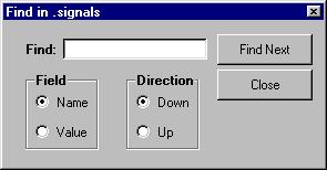 To find the specified text string within the Signals window, choose the Name or Value field to search and the search direction: Down or Up.